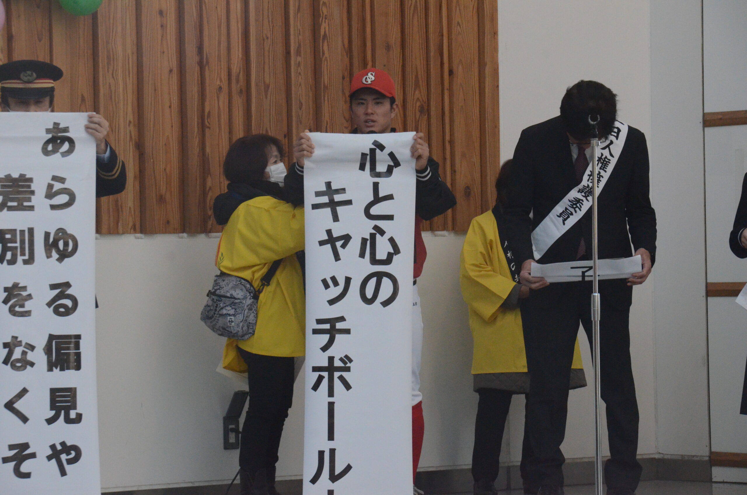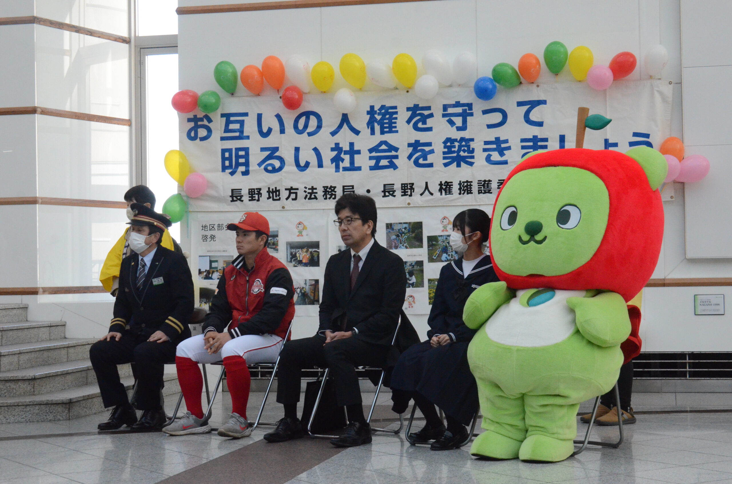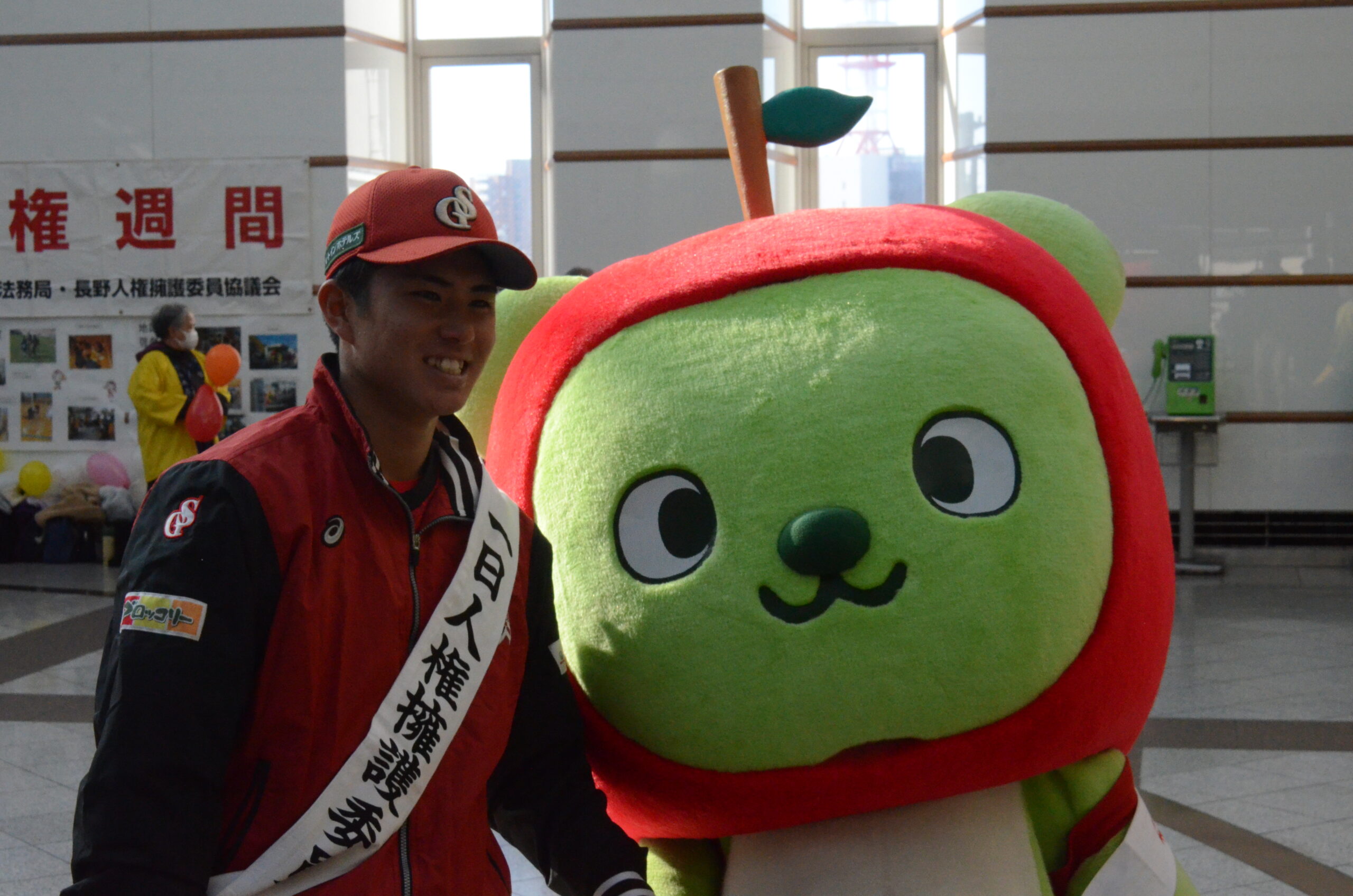 人権週間(12/4~10)に合わせて、人権尊重の重要性を正しく認識してもらうために9日に開催したイベントに、信濃グランセローズの中村泰雅選手が参加しました。