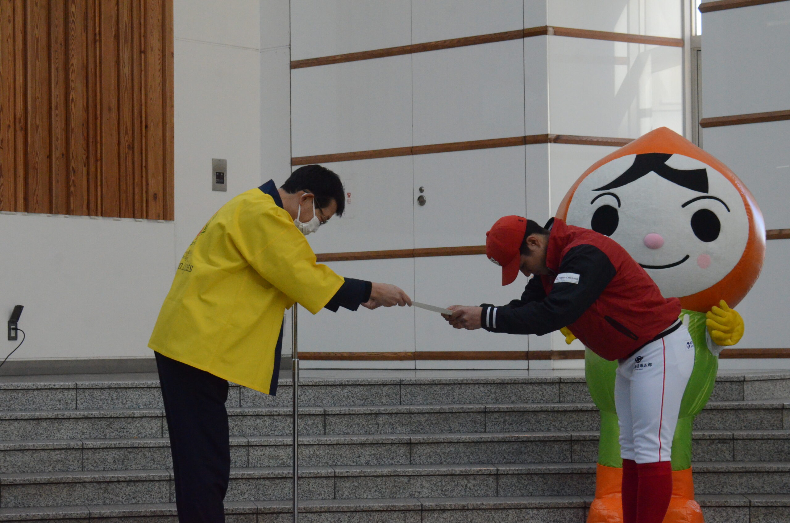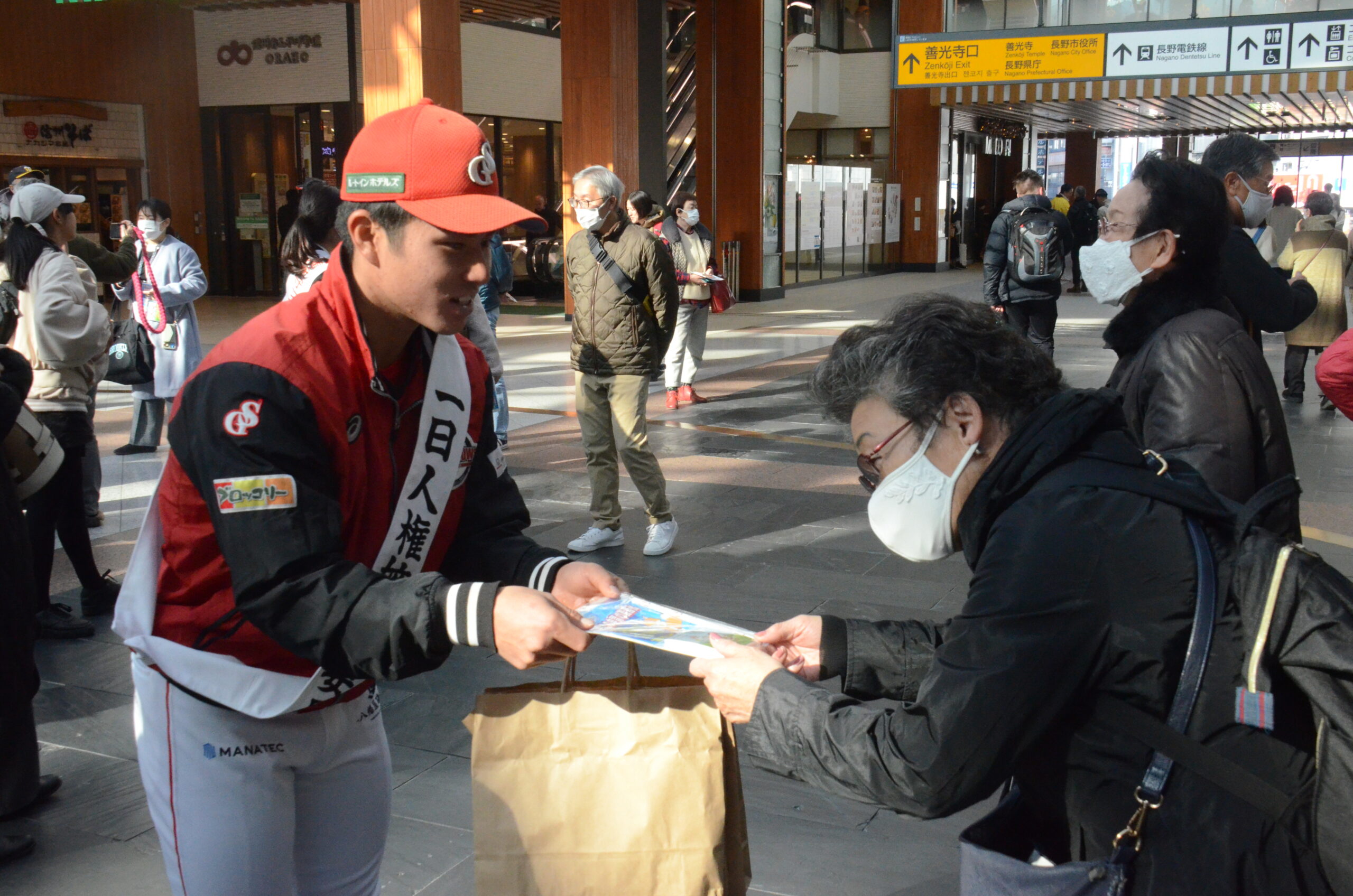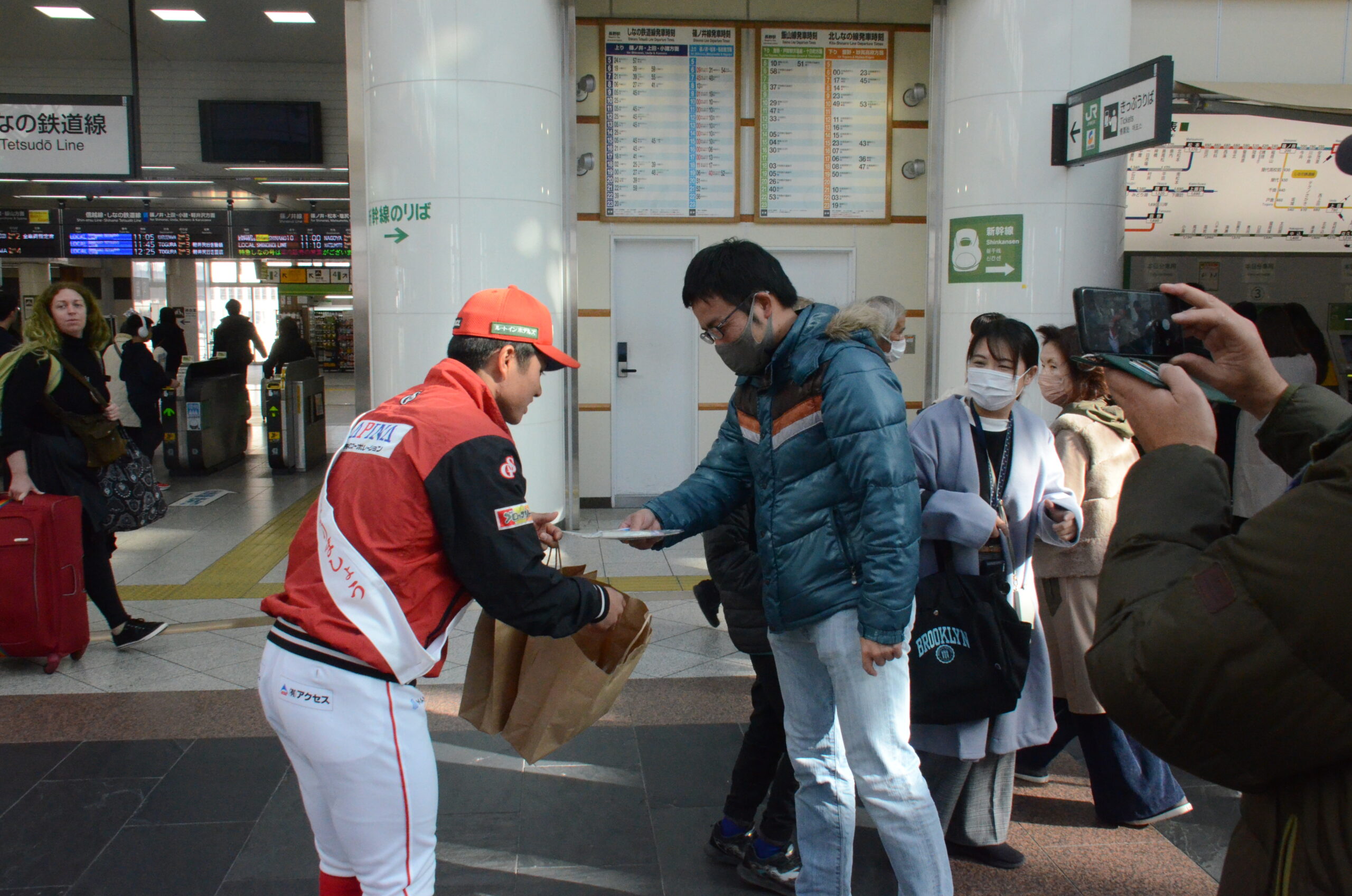 開会式には長野駅ということもあり多くの方が足を止めて様子を見ていました。式終了後に、長野駅利用者に啓発物の配布を行いました。長野県PRキャラクター「アルクマ」とのツーショットも📸