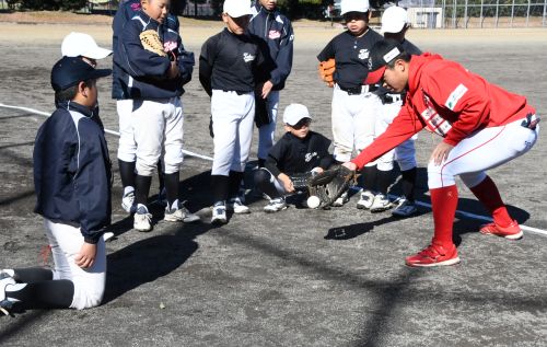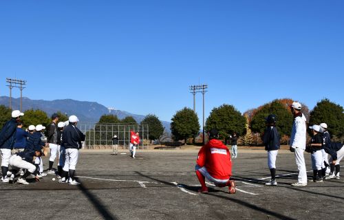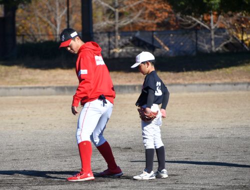お知らせ, 地域貢献活動 吉川新聞販売 主催 喬木 少年野球教室 掲載日: 2025年11月29日 吉川新聞販売店主催、 喬木少年野球教室が今年も開催されました。 講師は、山上信吾選手、三原田京成選手。 喬木少年野球クラブの18名が参加してくれました。 山上選手のキャッチボール指導。 三原田選手の守備の指導。 デモンストレーション。 山上選手のピッチングとバッティング。