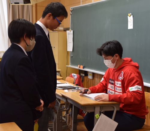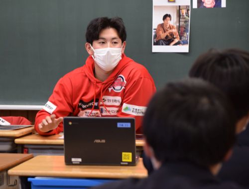 お知らせ, 地域貢献活動 更埴西中「職業講演会」 掲載日: 2025年1月24日 千曲市立更埴西中学校の「職業講演会」で 奈良雄一郎選手が講師を務めました。 生徒たちからは ・どうして野球を職業にしようと思ったか ・毎日どのくらい練習しているか など、事前に多くの質問がまとめられていましたので、 それに沿った形で話が進みました。 上田市出身の奈良選手です、 身近に感じてもらえた様子。 来年は是非応援に来てください。 お待ちしてます。