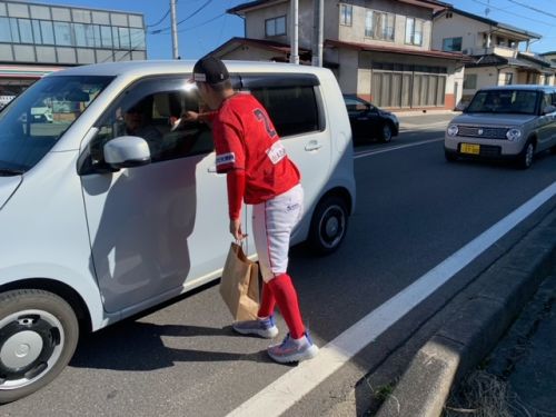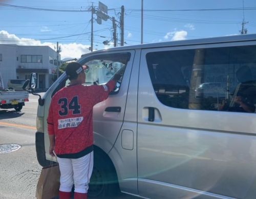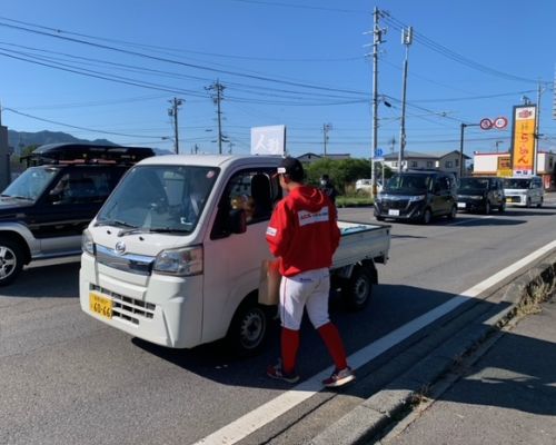 選手は、信号待ちの運転手さんにティッシュとキーホルダーを渡しながら、