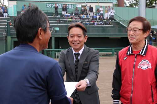 「第57回中野市ちびっ子野球大会」の開会式で贈呈式を行いました。
