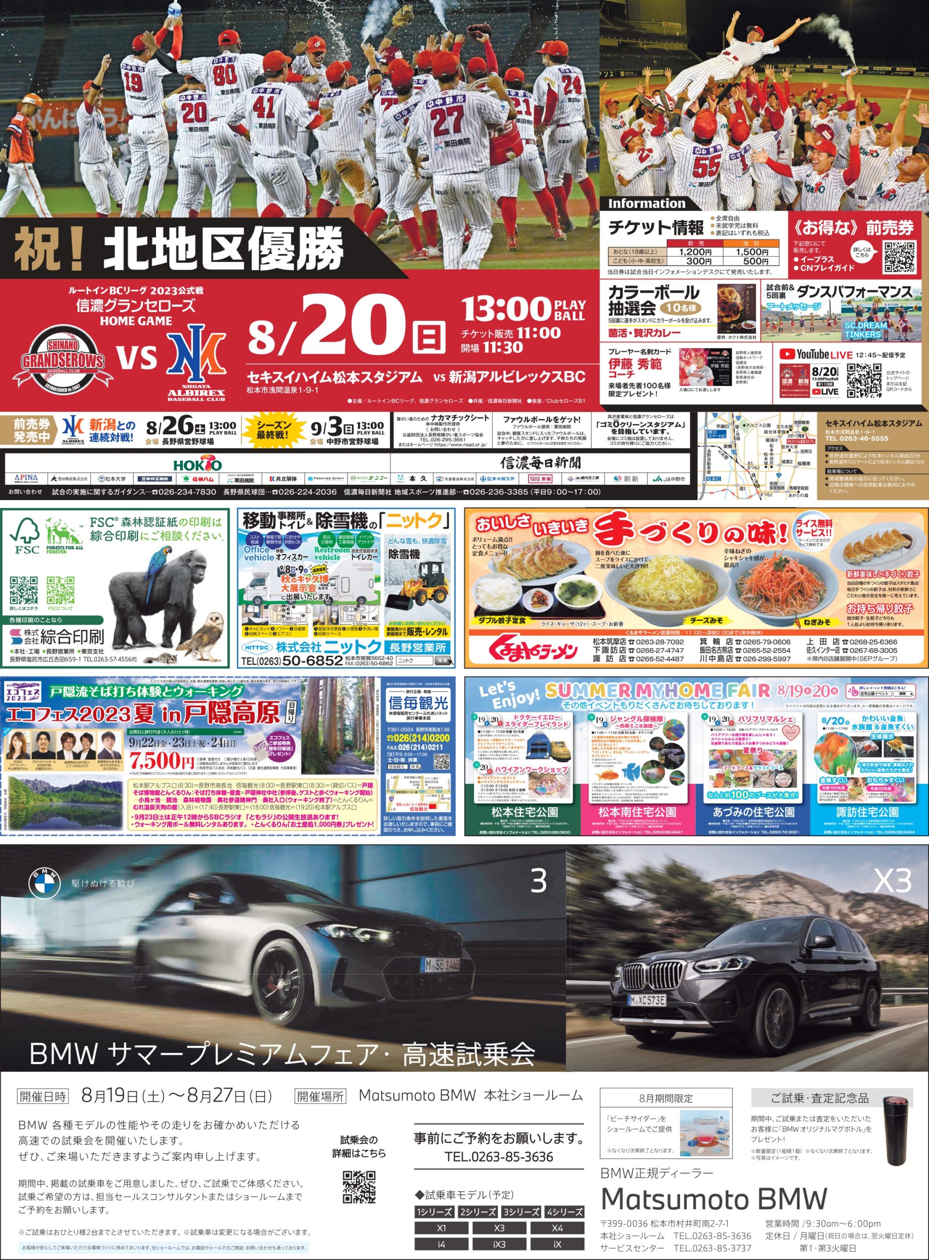 お知らせ, マッチデースポンサー 8月20日vs新潟戦(@ハイスタ松本)マッチデースポンサー紹介 掲載日: 2023年8月19日 マッチデースポンサー紹介(五十音順) ・㈱エーワンオートイワセ ・くるまやラーメン ・㈱サンフジ企画 ・信毎観光 ・㈱綜合印刷 ・㈱ニットク ご協賛、誠にありがとうございました。